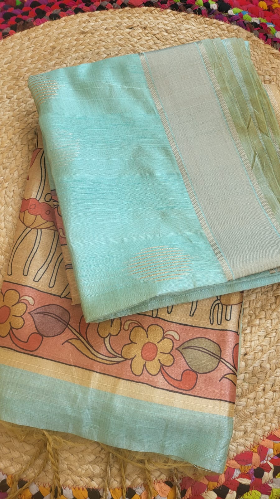 Pastel Green Raw Silk Saree with Kalamkari Motifs & Gold Zari Buttas
