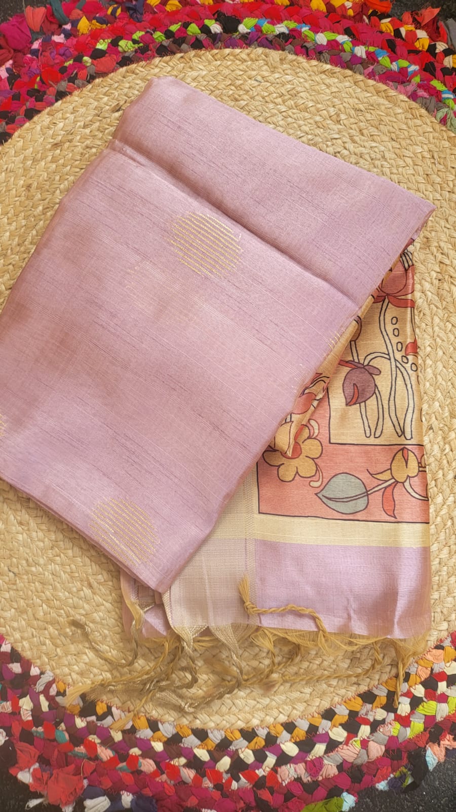 Elegant Pastel onion Pink Raw Silk Saree with Kalamkari Moti
