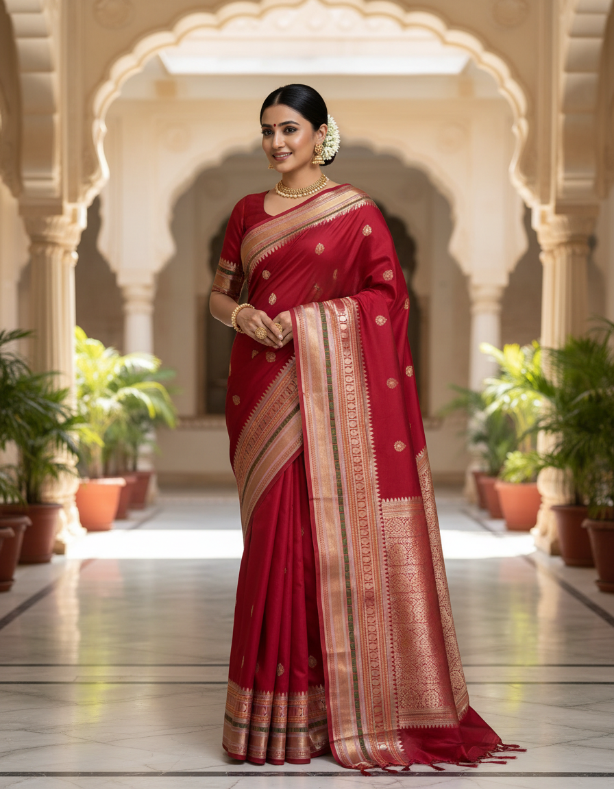 Traditional Crimson Kattan Silk Saree with Elegant Zari Motifs