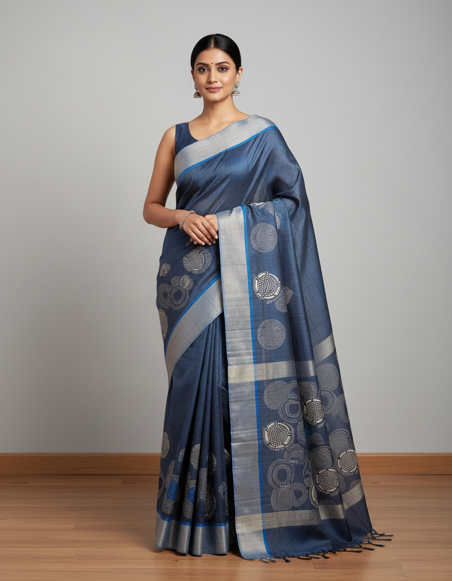 Elegant Steel Blue Semi-Tussar Saree with Silver Zari Butta & Contrast Border
