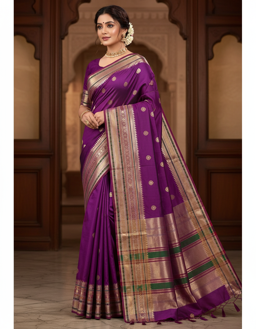 Royal Purple Kattan Silk Saree with Zari Butta & Temple Border