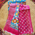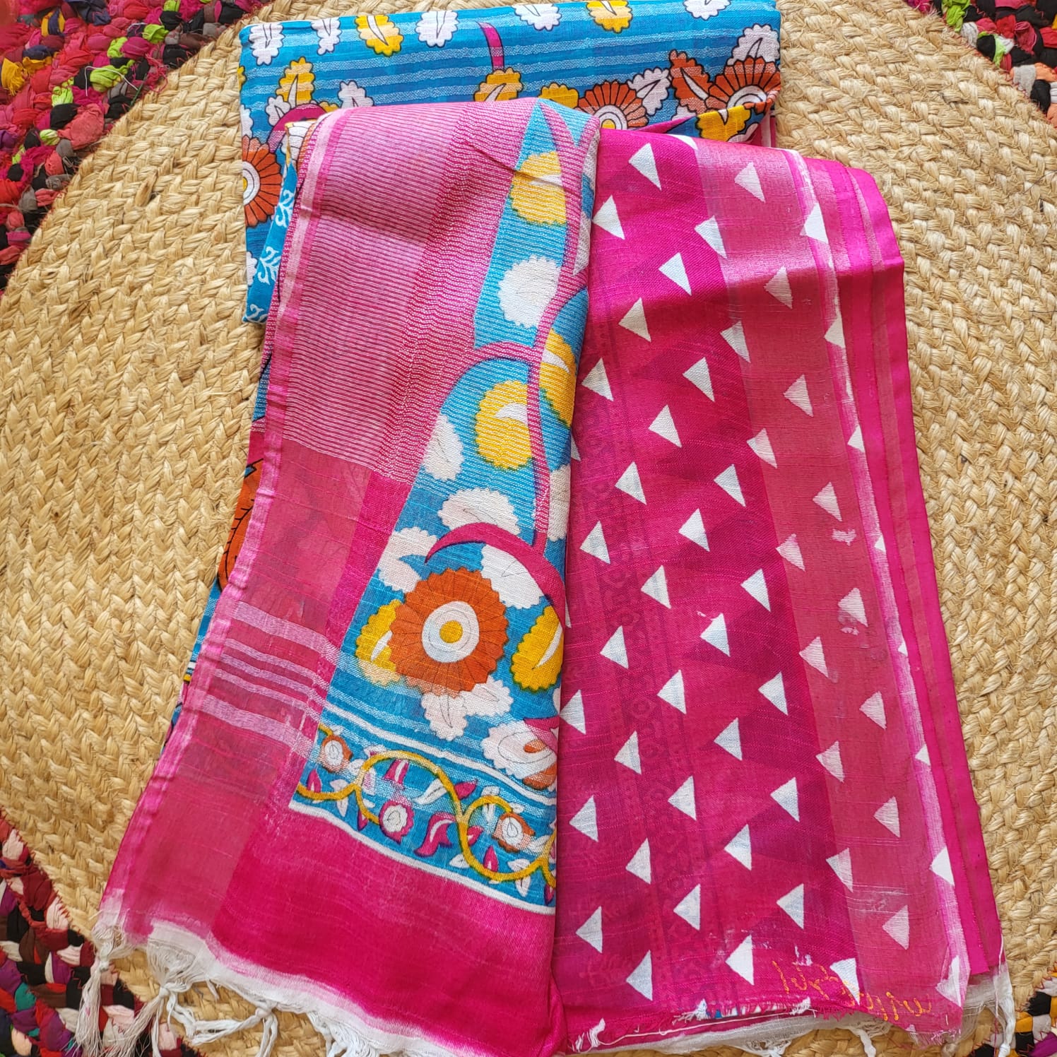 This stunning linen cotton saree features a refreshing blue base adorned with delicate white leafy motifs, giving it a graceful and modern touch. The saree is beautifully complemented with a vibrant pink border highlighted by a colorful artistic pallu design, adding charm and sophistication. Lightweight, breathable, and easy to drape, this saree is perfect for both casual and festive occasions, offering you comfort with elegance.