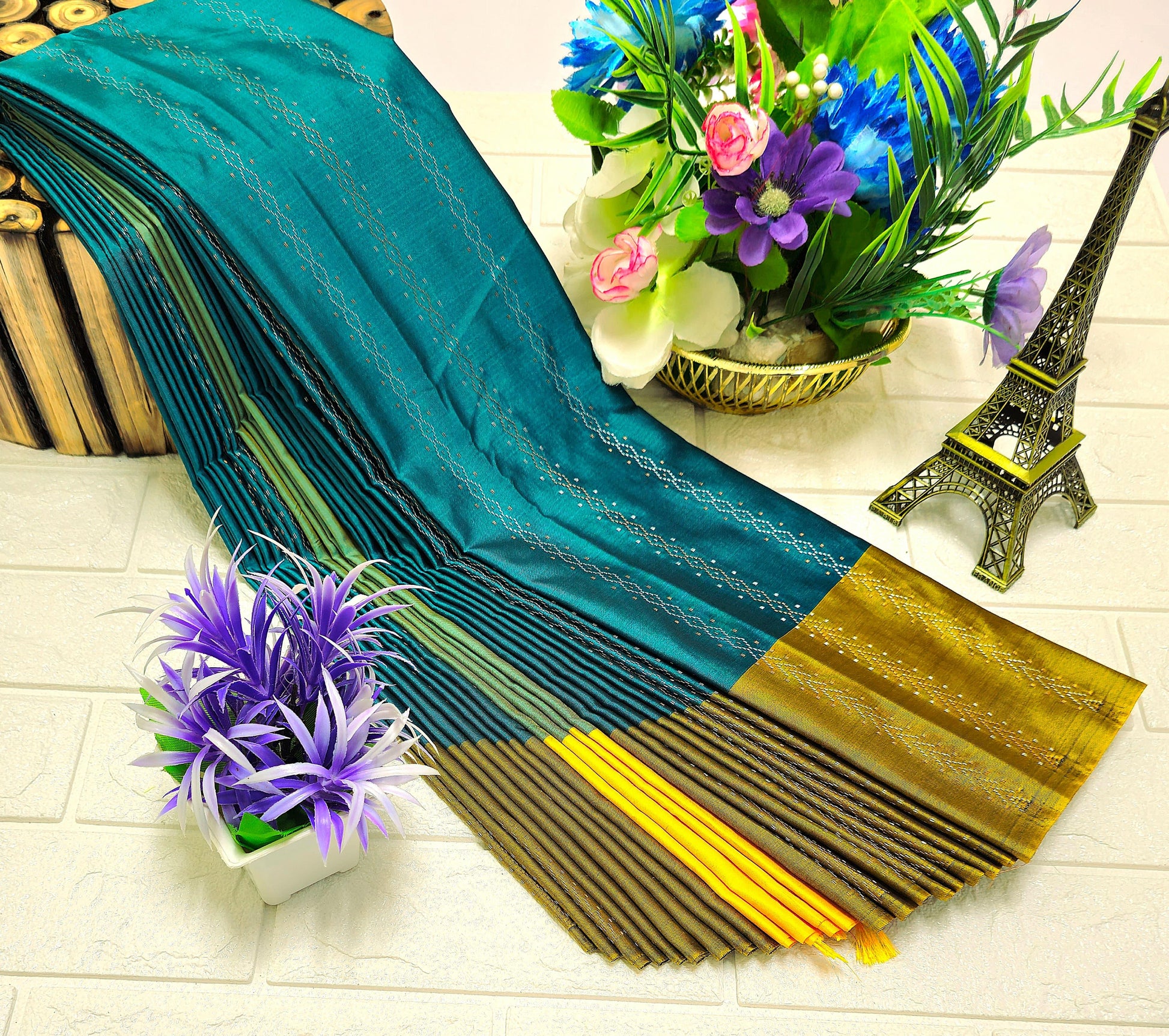 This elegant Arani silk saree comes in a rich teal blue shade with delicate golden thread lines running throughout. The saree is paired with a mustard and olive green border and pallu, giving it a graceful and stylish look. It includes a matching running blouse in the same design. The fabric is soft, lightweight, and easy to drape — perfect for festive wear, family events, or casual occasions. Simple yet classy!