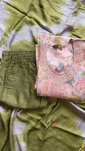 This enchanting three-piece kurthi set is tailored from luxurious modal silk and features a flowy, pastel-printed kurtha with elegant embroidery on the neckline. The set is complemented by contrasting olive green pants and a matching dual-toned dupatta for a refined ensemble. The soft silk fabric drapes beautifully, ensuring both comfort and sophistication. Perfect for festive occasions or daytime celebrations, this set exudes a blend of modern grace and ethnic allure.