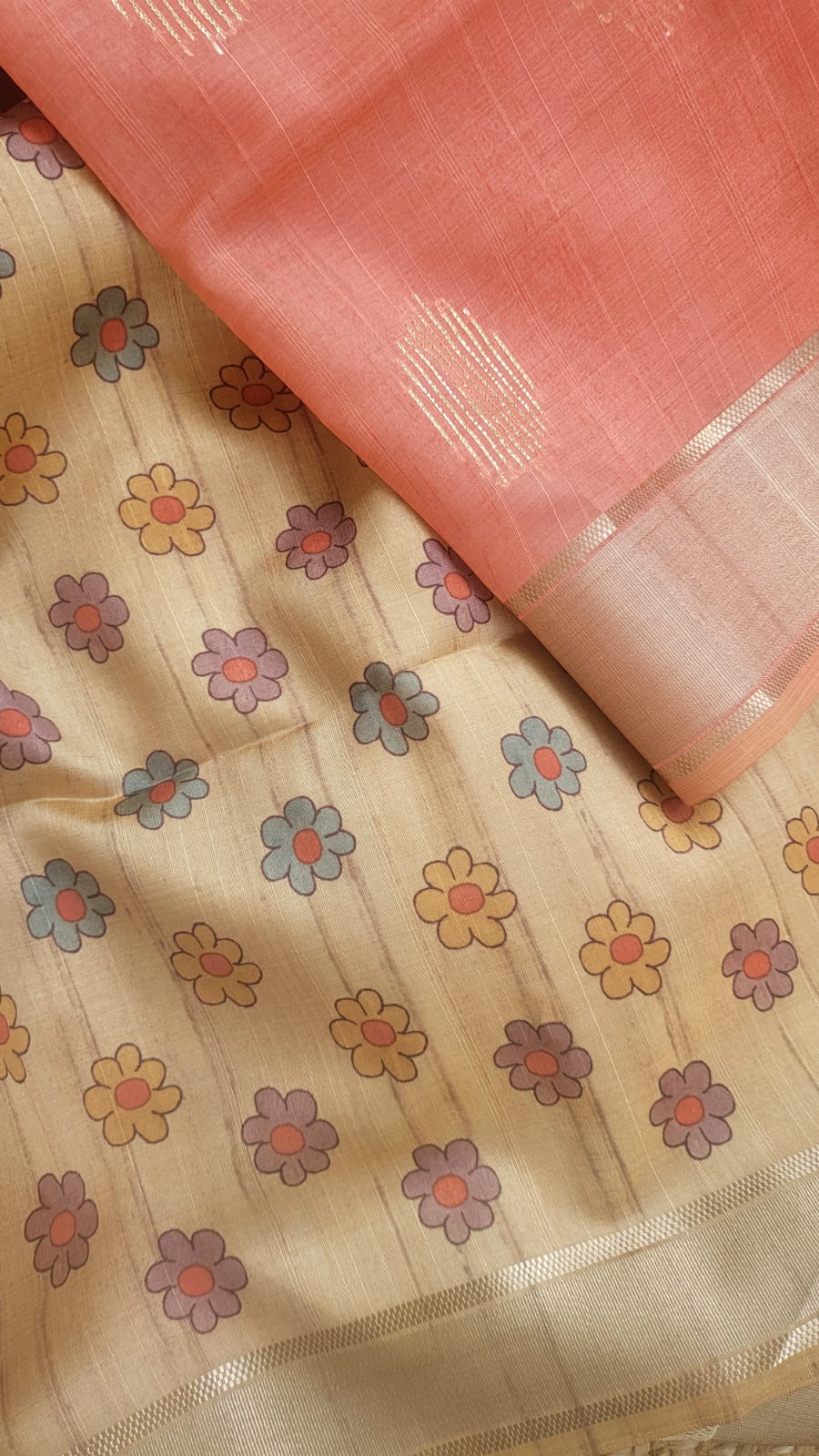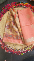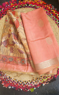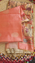 Pastel Orange Raw Silk Saree with Kalamkari Motifs & Gold Zari Buttas